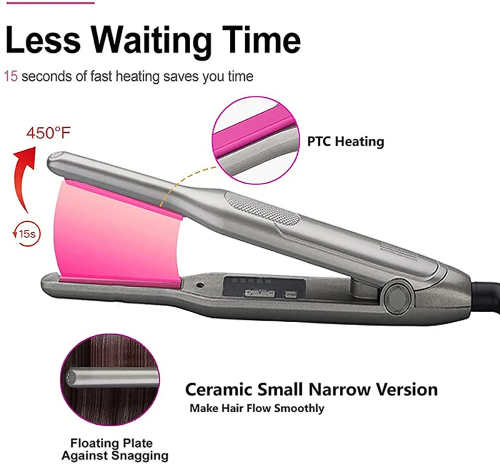 Our small flat iron has professional MCH heating modeul which make 15 senconds reach up to 450°F , saving your waiting time. The 3/10 floating plate provides various angles to make style and better get to the roots and edge .ideal for shorter hair, thick, curly, wavy hair or men's beard.